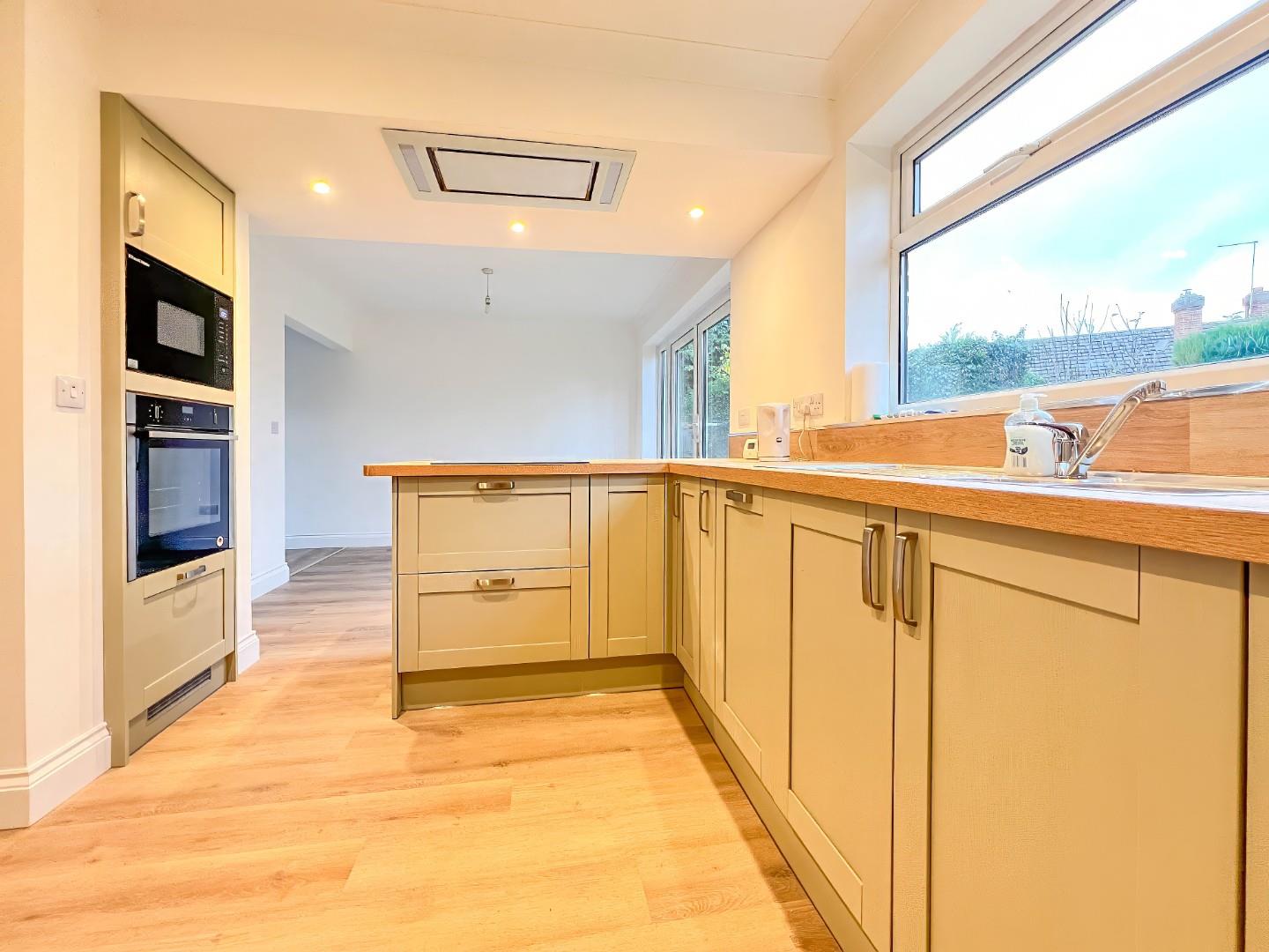 Fully fitted kitchen with an ample range of kitchen units with worktop surfaces with an inset, 1 1/2 half bowl stainless steel single drainer sink unit with mixer tap with storage under. Incorporating, various built in kitchen appliances, such as, built in oven with slide & hide door with microwave oven over, fitted inset hob with extractor hood over, & fridge freezer, in addition there is a double glazed window that overlooks the rear garden with door to the side providing access to the rear lobby.