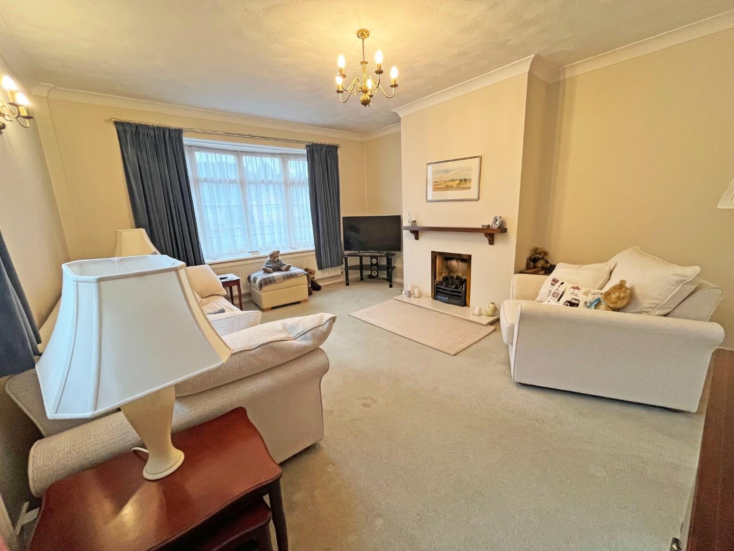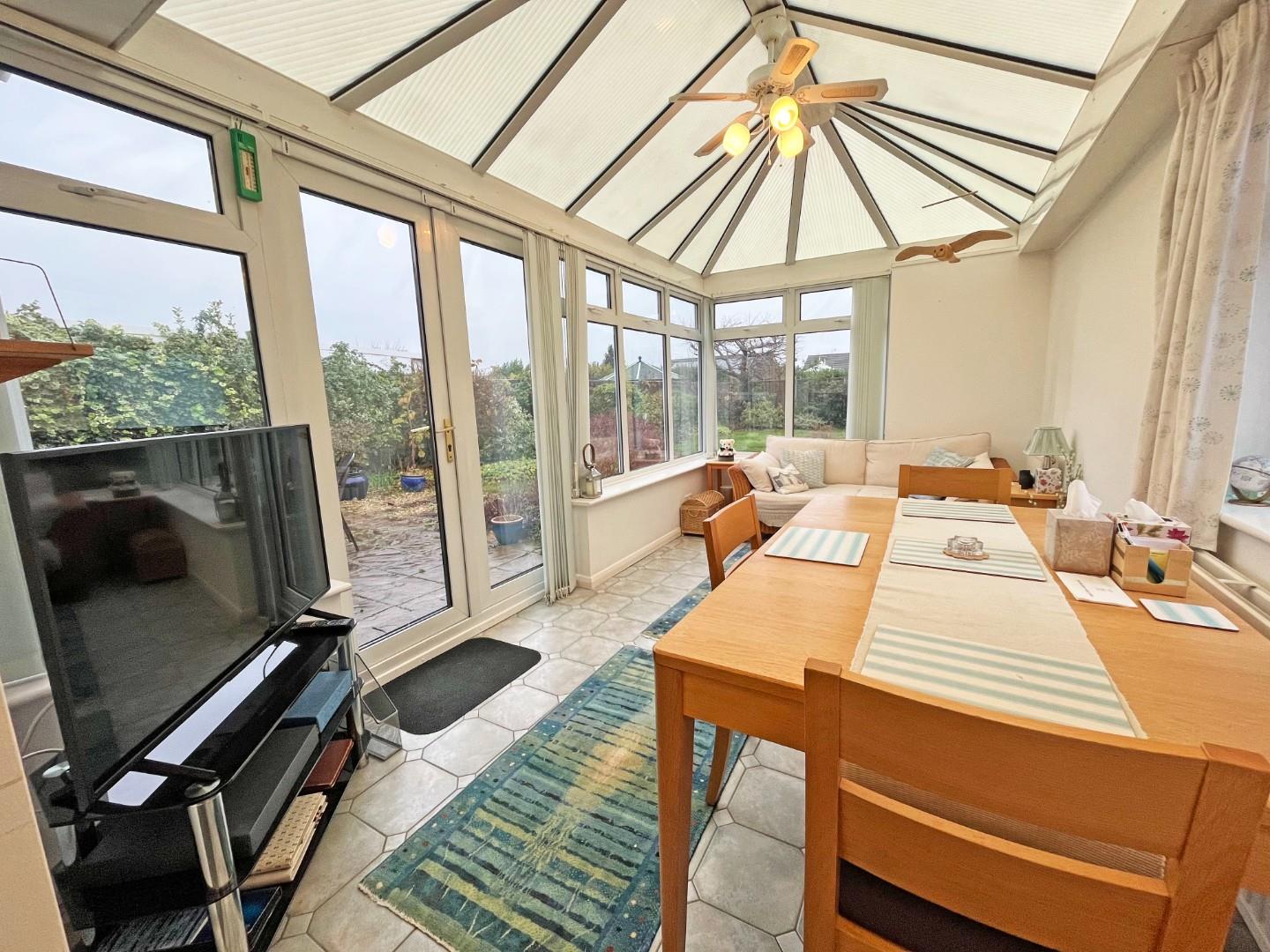 Entrance hall with airing cupboard and store cupboard, lounge with bow window to the front, kitchen with pantry, arch through to the sun room, double doors to the garden.