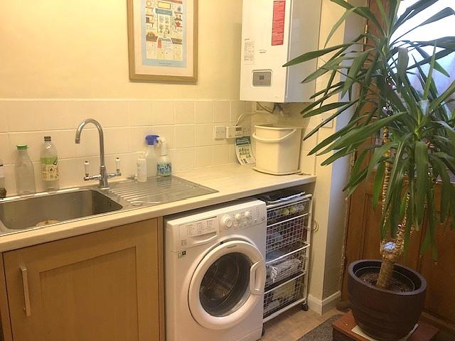 • Utility Room: Fitted storage unit with space available for free standing fridge freezer unit, further space with plumbing available for washing machine, with door to the side, leading into the rear garden.