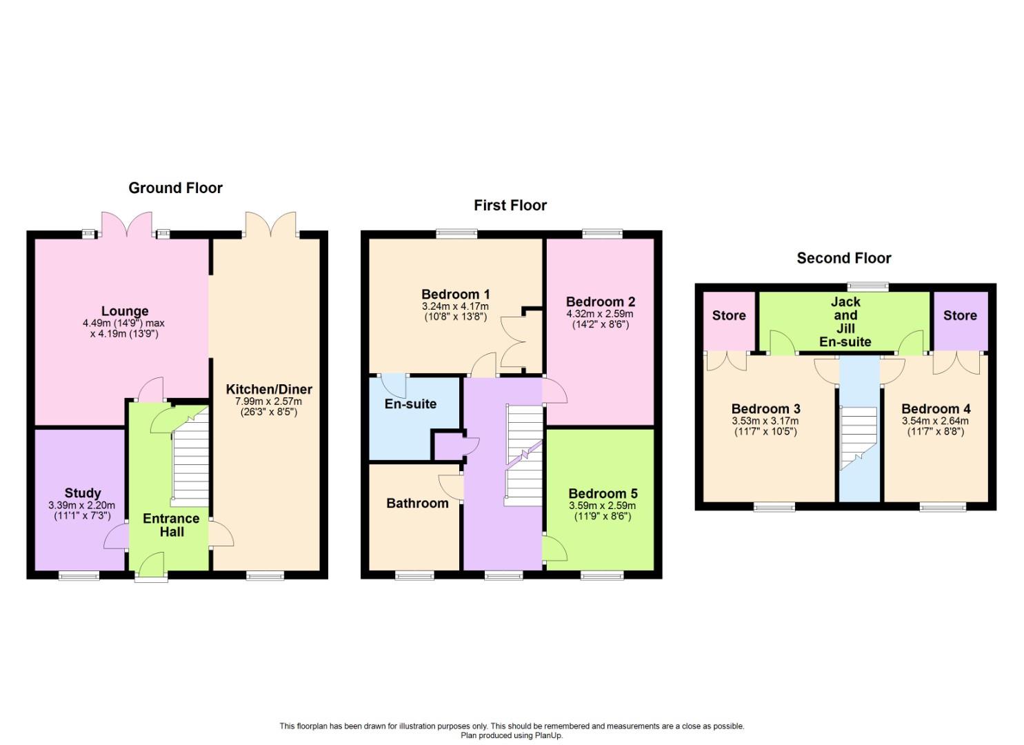 The property comprises of an entrance hall that leads through to a nearly 8m long kitchen/diner with double doors leading out the garden. The re-fitted kitchen is a great size with plenty of worktop and cupboard space, you will also benefit from a built in dishwasher and oven. The lounge also has access to the garden is a great size. On the ground floor you will also find a study and cloakroom. On the first floor is the master bedroom with built in wardrobes and a shower en-suite. You will also find bedroom two and bedroom five and a family bathroom with bath and shower. On the second floor there are two more double bedrooms with built in storage and access to a jack and jill bath en-suite.