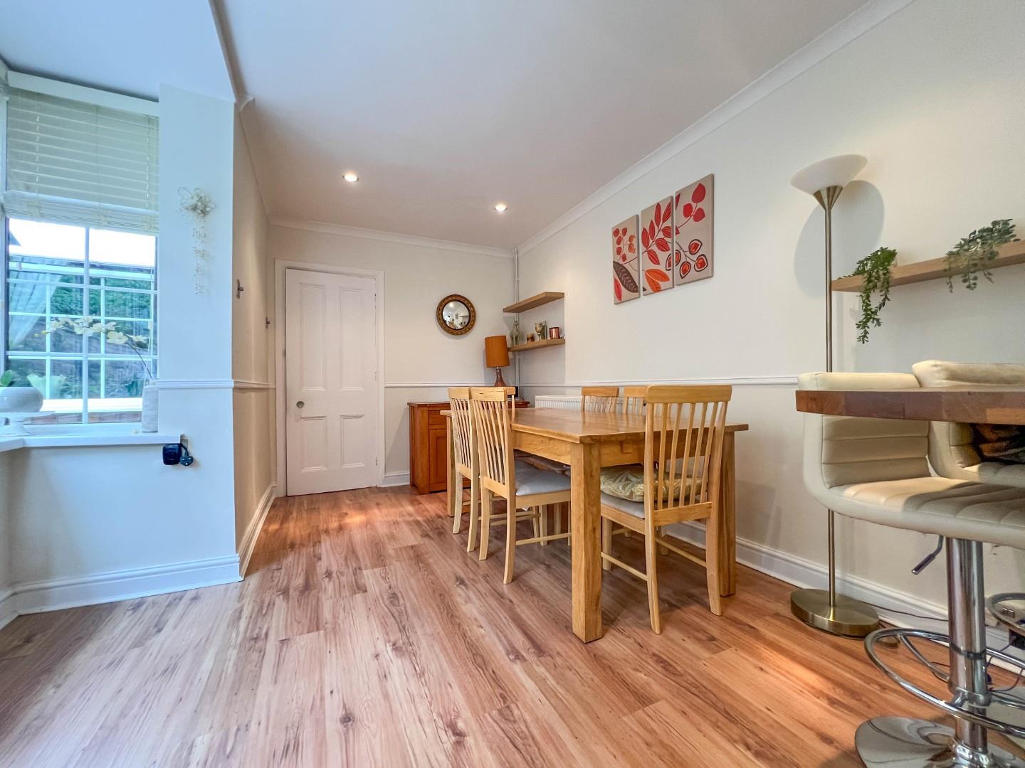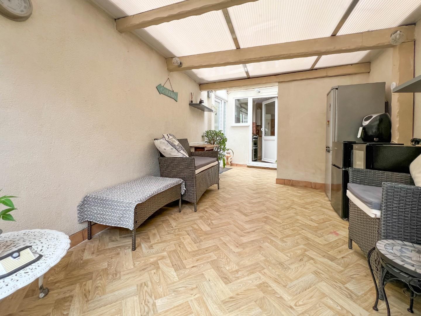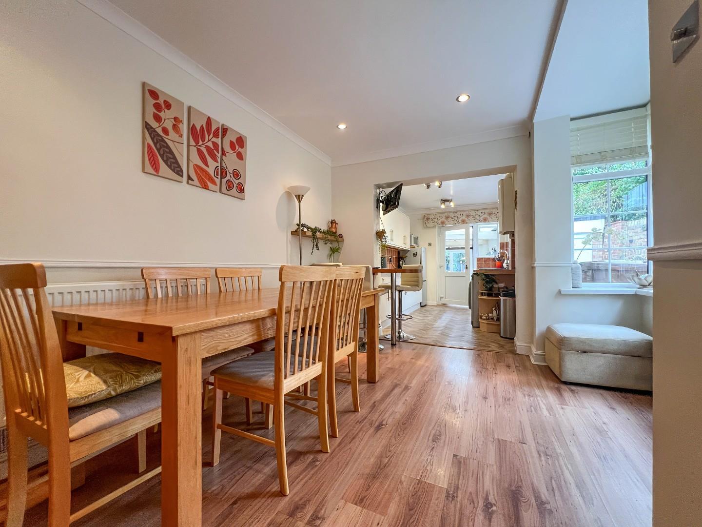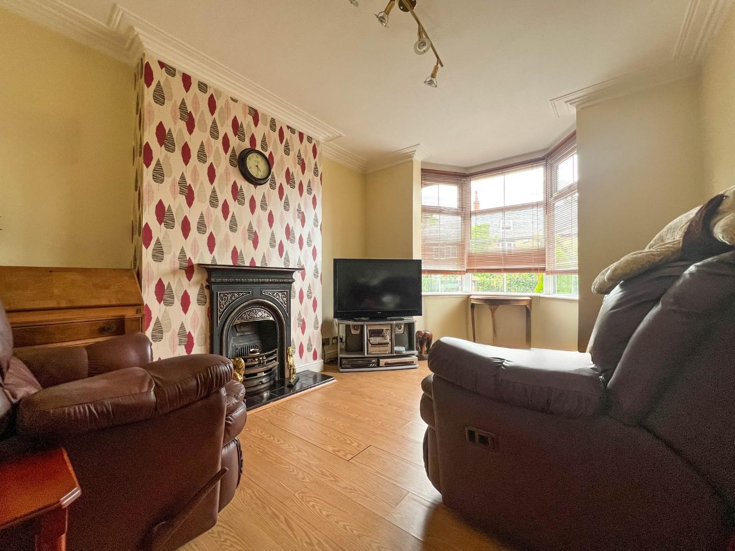 From the front, porch leads into the hallway with parquet style flooring with stairs leading to the first floor & landing, from here, separate doors lead to both the lounge & family rooms. Lounge to the front of the property offers, double glazed bay window to the front aspect and a cast iron ornate feature surround fireplace with tiled hearth. The family room off the hall, provides ample living space benefitting from fireplace surround inset fire, dual aspect windows to side and rear and an under stairs storage cupboard, from here, door leads into a good size dining room area, featuring a large, double glazed box bay window to the side aspect with a wall mounted electric heater, laminate flooring and ceiling mounted spotlights, opening into the kitchen space, benefits from a range of wall and floor level fitted storage units with matching breakfast bar, with ample worktop surfaces with tiled splashbacks, and an inset 1 & 1/2 bowl single drainer sink unit with a swan neck style mixer tap, with storage under, spaces available for washing machine and a fridge freezer, window to the side with door leading through to the garden room. Garden room provides ample space housing a wall mounted panelled heater, with door to the side aspect leading to the driveway with further double doors leading out into the rear garden, lastly, further door leading into a two piece cloakroom.