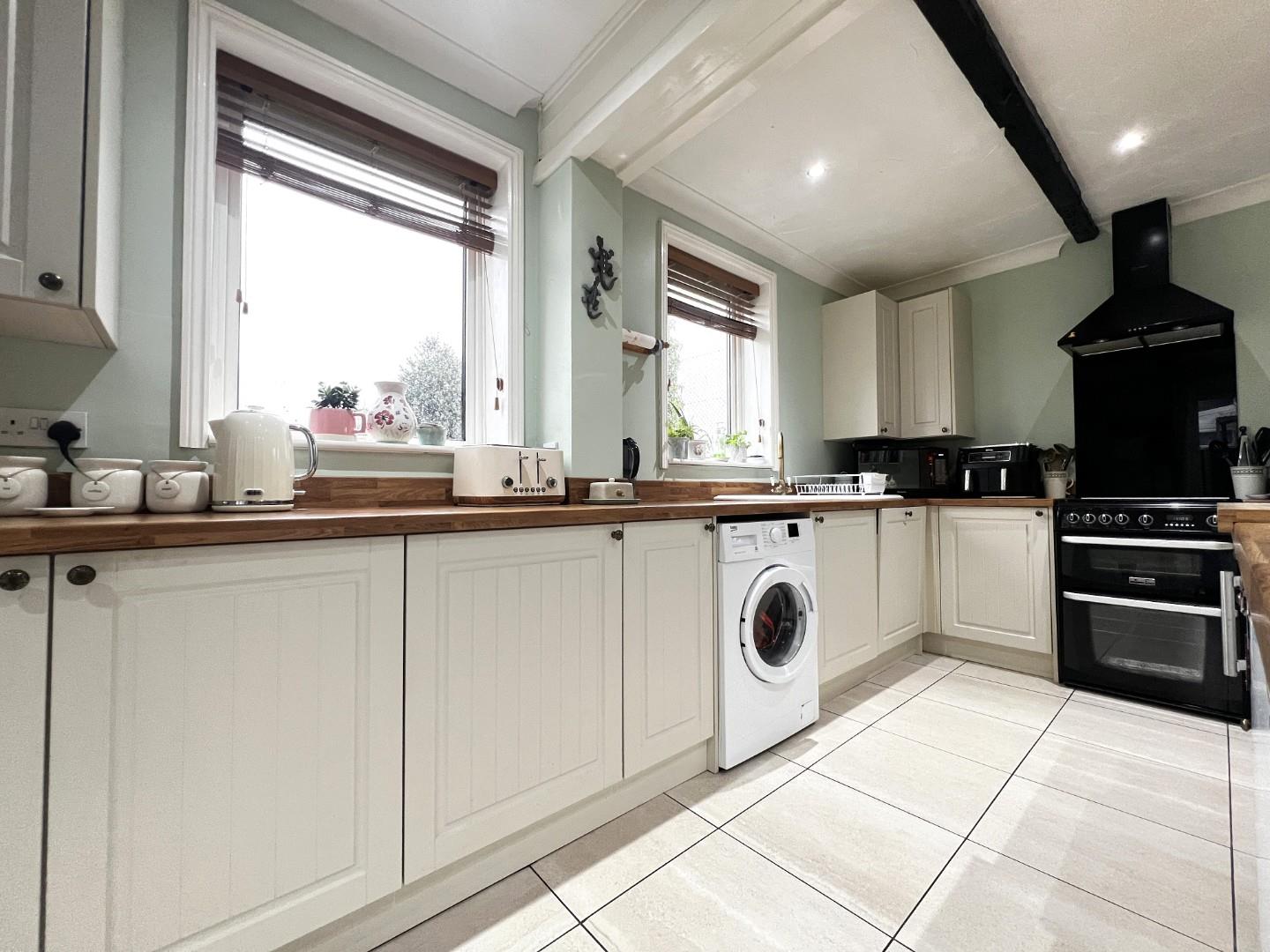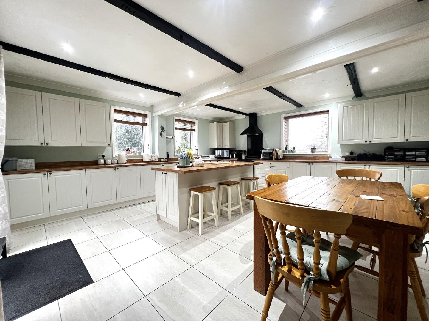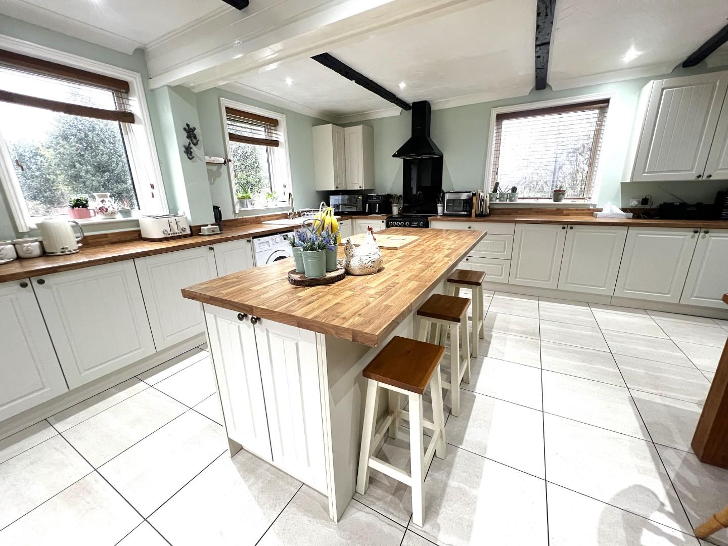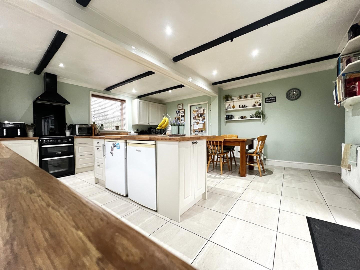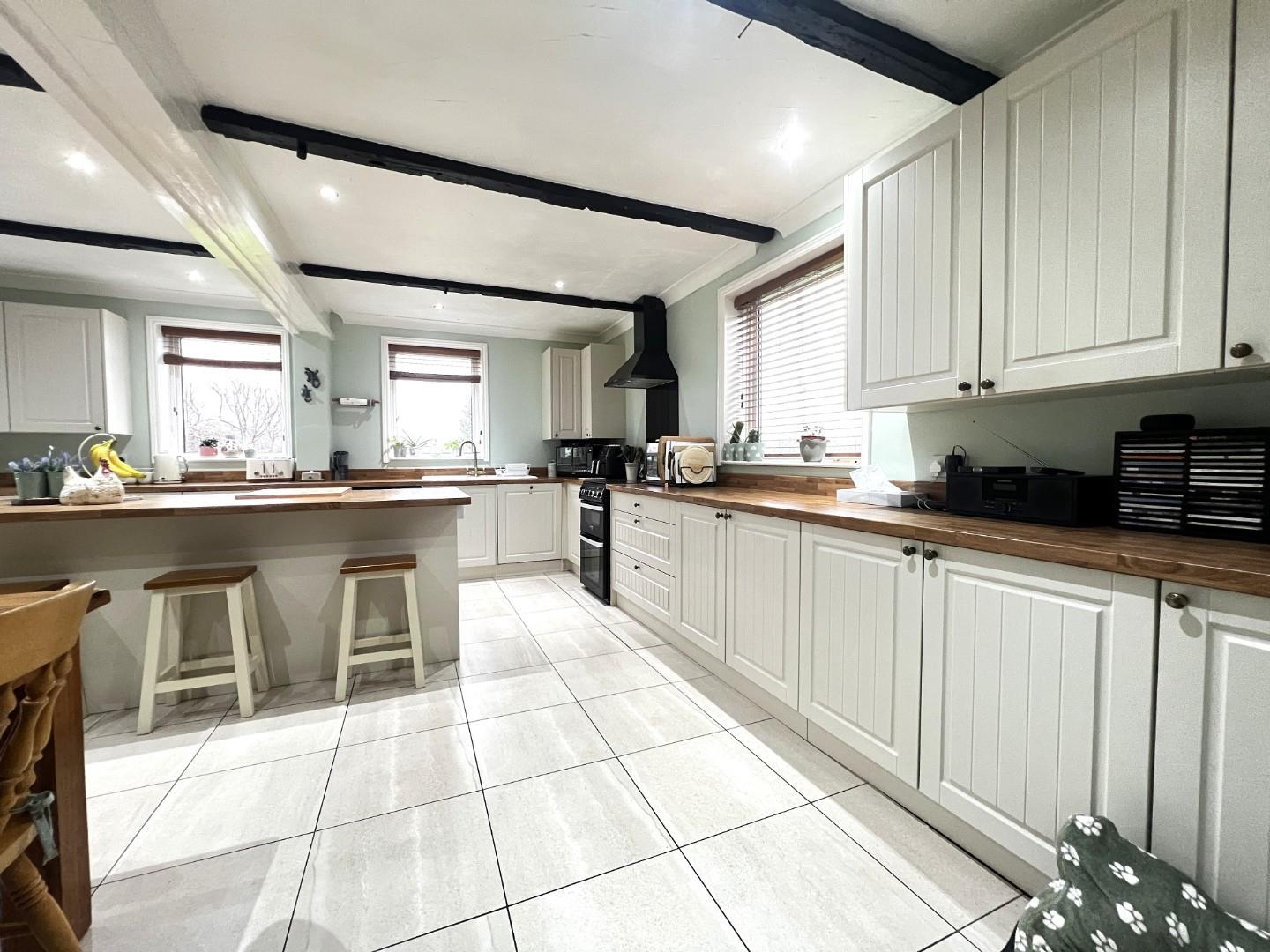Re-Fitted Kitchen/Diner: Comprising a comprehensive range of wall and floor level units, including an island unit with breakfast bar with storage & space for fridge & freezer units, integrated dishwasher, dual aspect windows and double doors to the side providing access onto a large paved patio area, ceiling mounted spotlights and large style ceramic flooring.