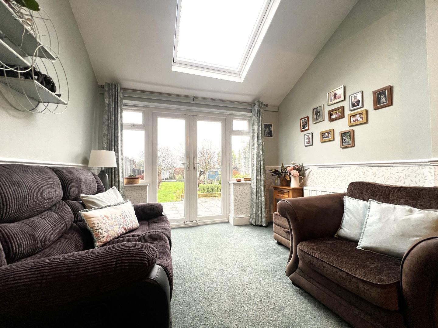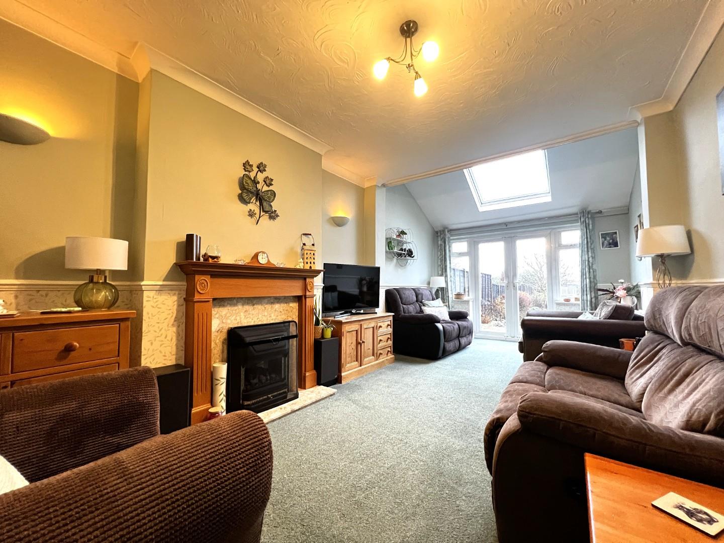 Family Room: Featuring, double doors leading out onto a paved patio area and velux style roof window, feature wall lights with fireplace surround.