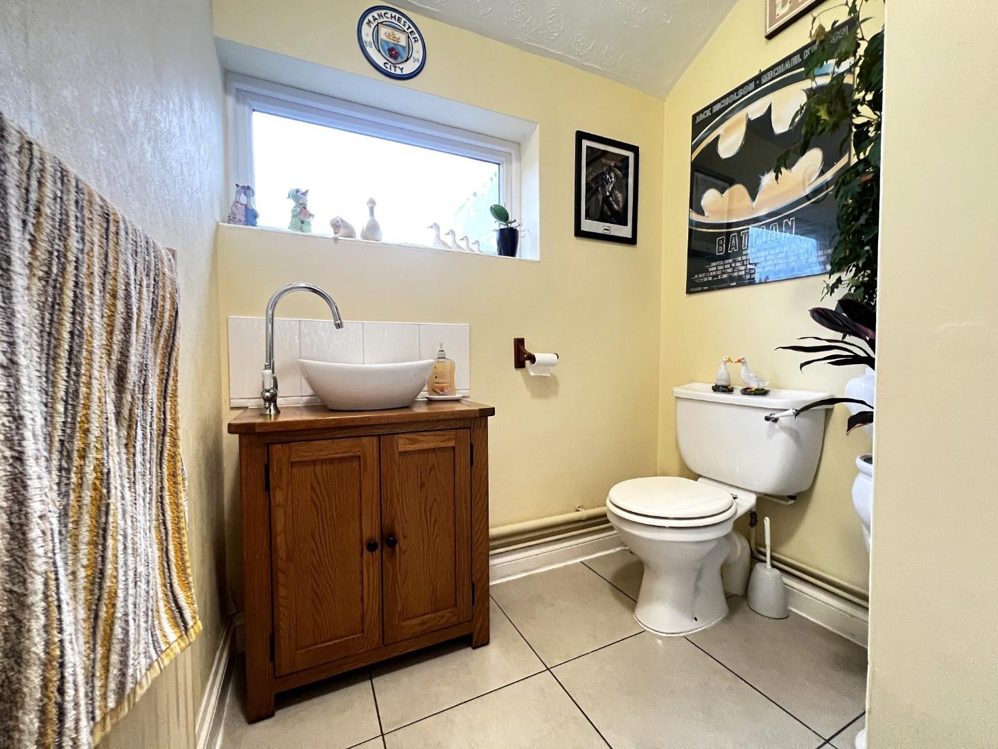 Cloakroom, comprising of a two piece suite with window to the rear & tiled flooring