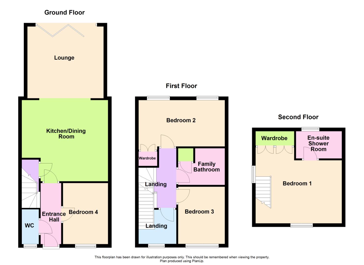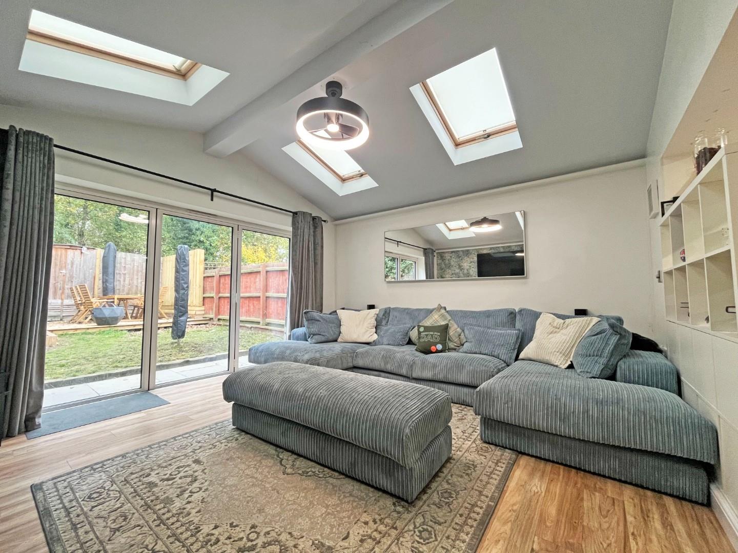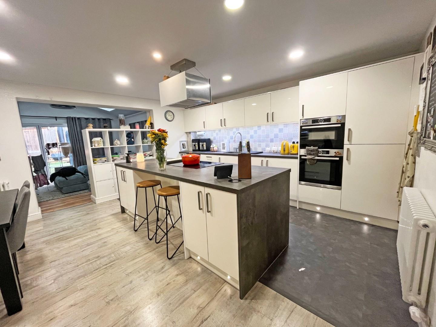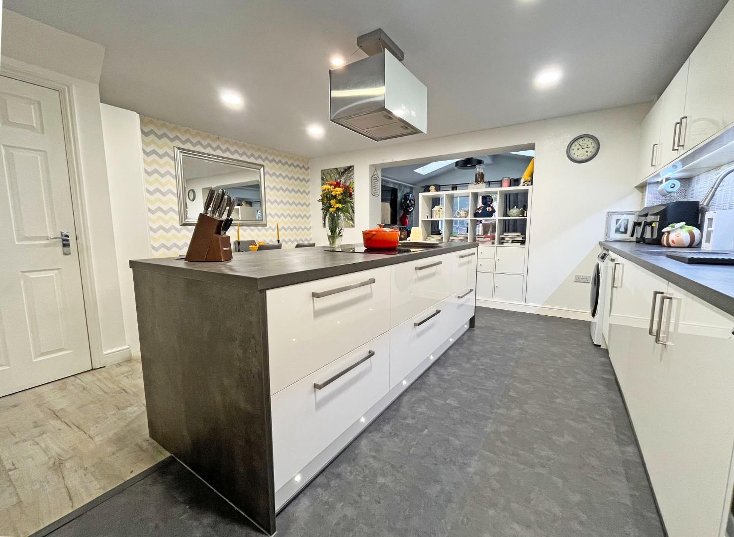 Ground Floor- entrance hall with downstairs w/c, bedroom four, impressively re-fitted kitchen/dining room with understairs cupboard and feature island, lounge extension with velux windows and bio fold doors to the garden.