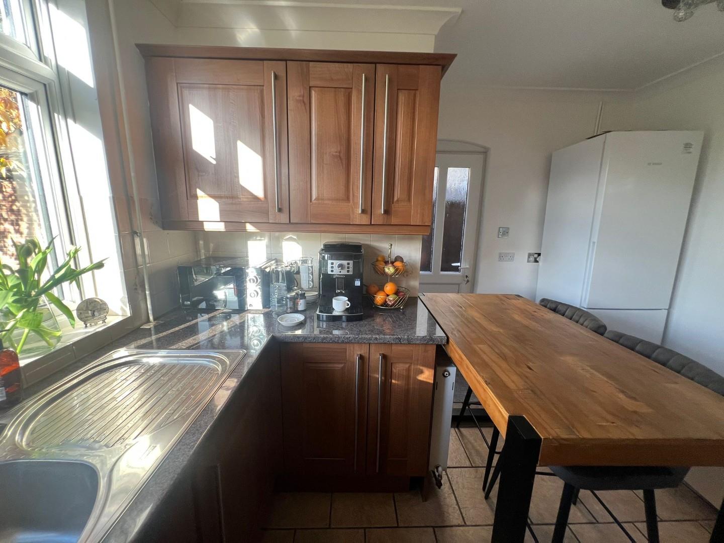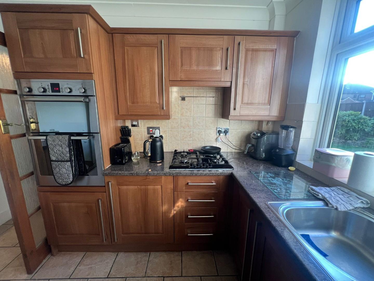 Double glazed window to the rear aspect. Fitted with a range of base and eye level units with complimentary work surfaces over, plumbing for washing machine, integrated double oven, ceramic hob with extractor hood over, ceramic tiled splashbacks and tiled flooring, radiator.