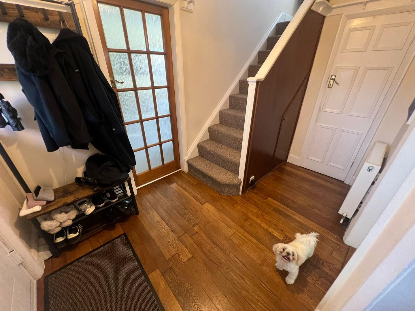 Wooden flooring, stairs to the first floor and landing, double radiator.