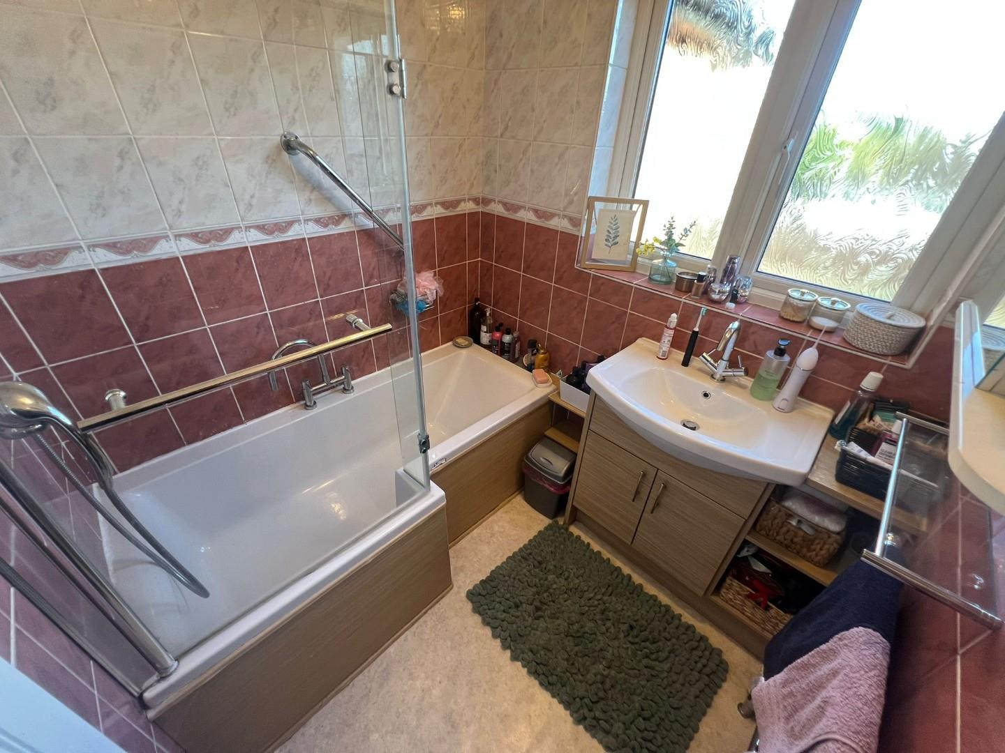 Double glazed window to the front aspect. Fitted with a two piece suite comprising p shaped bath with shower over and glass screen and a vanity wash hand basin, fully tiled walls, radiator.