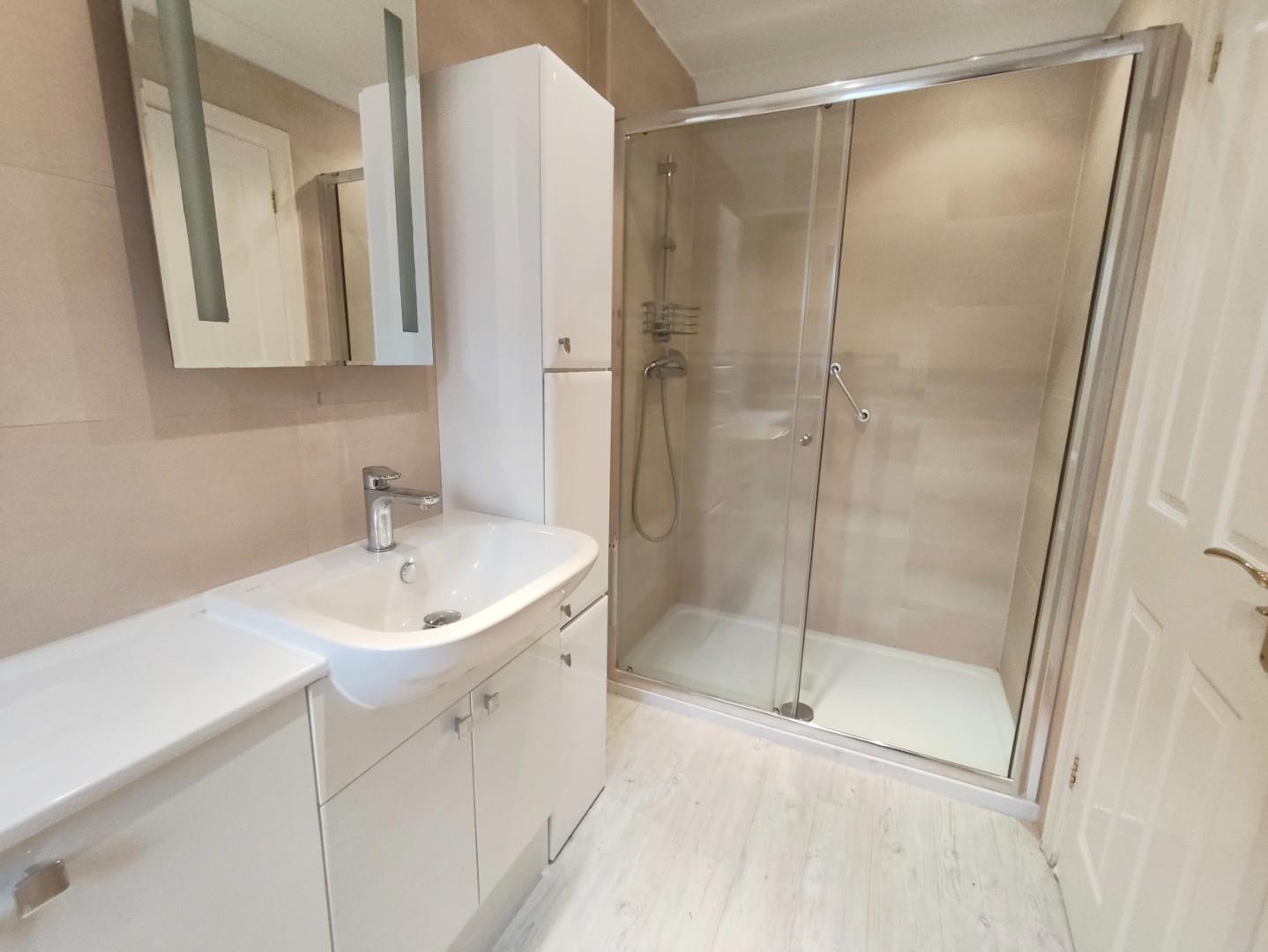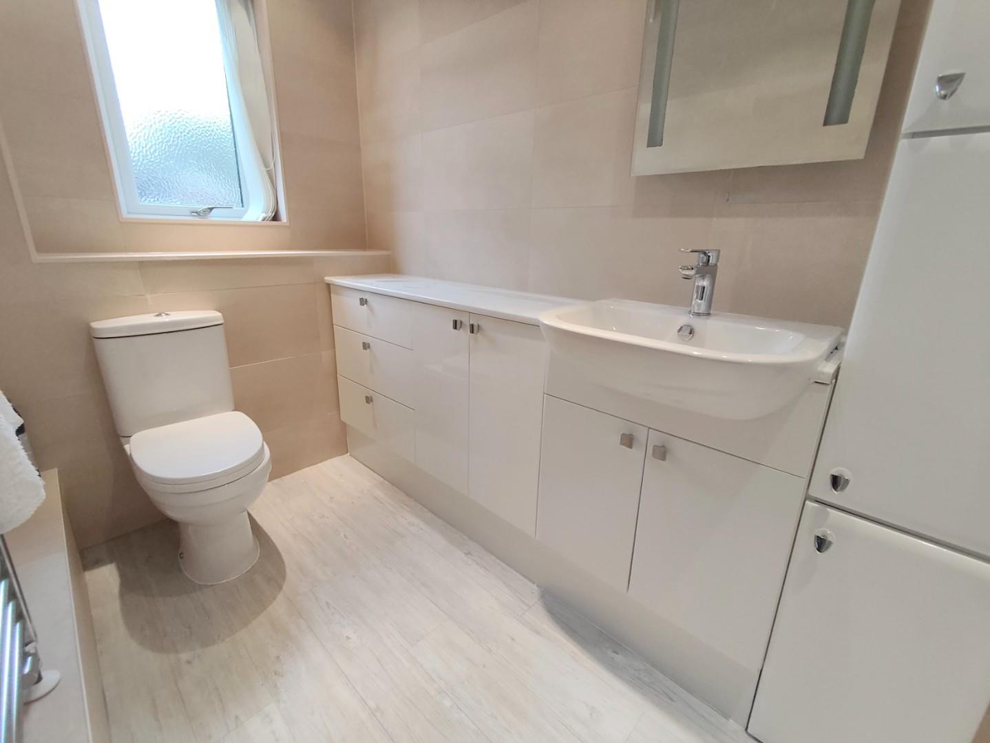Re-fitted with walk in shower enclosure, Vanity hand wash basin and tall storage unit, low level W.C. heated towel rail.