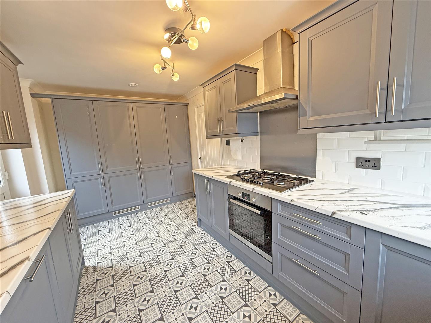 Fitted with a range of modern kitchen units incorporating fitted electric oven and five ring gas hob with a cooker hood above, plumbing for a washing machine, integrated larder fridge, freezer and dishwasher. Door to the rear garden.