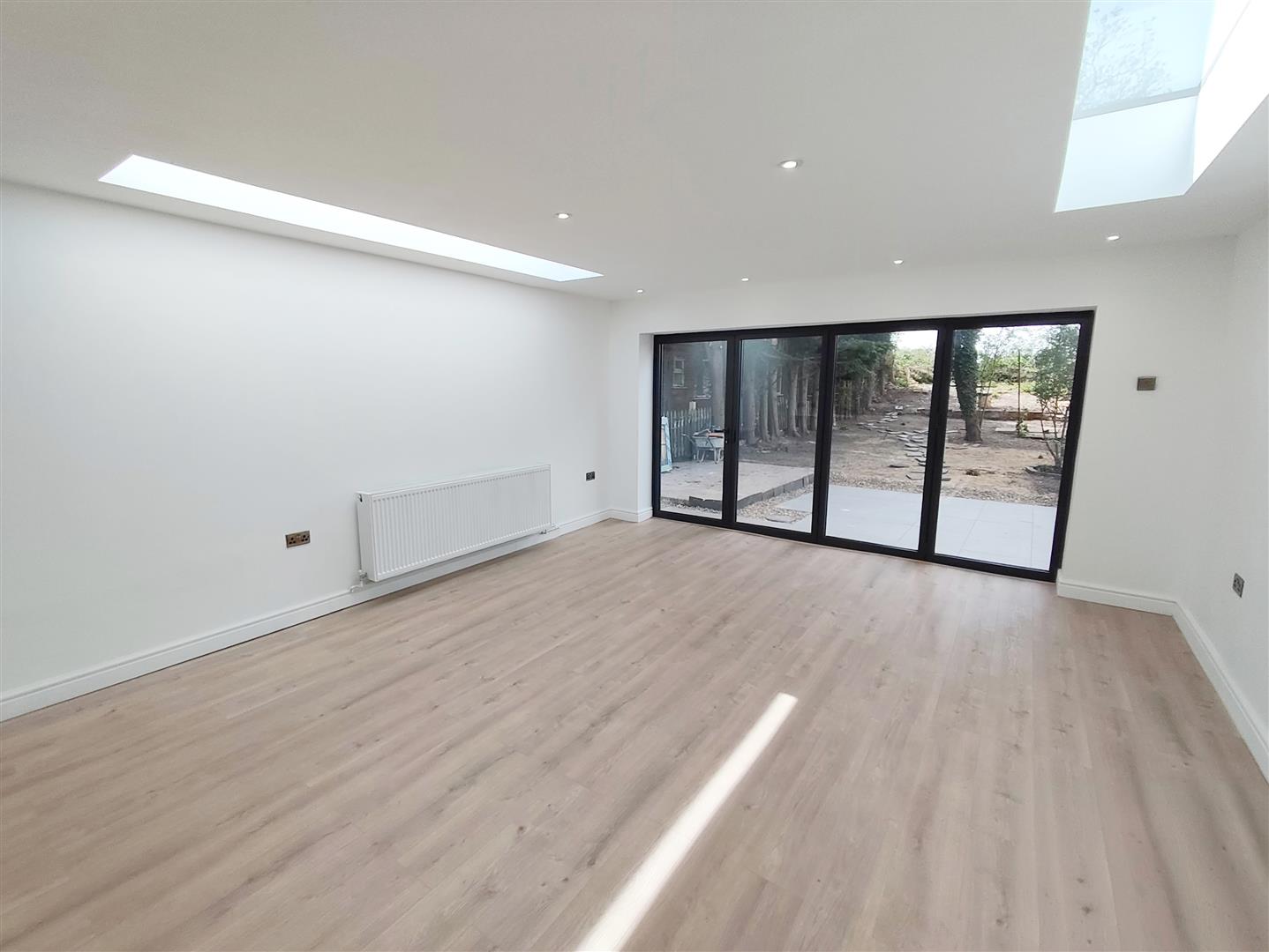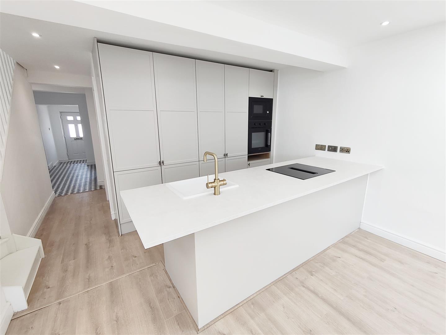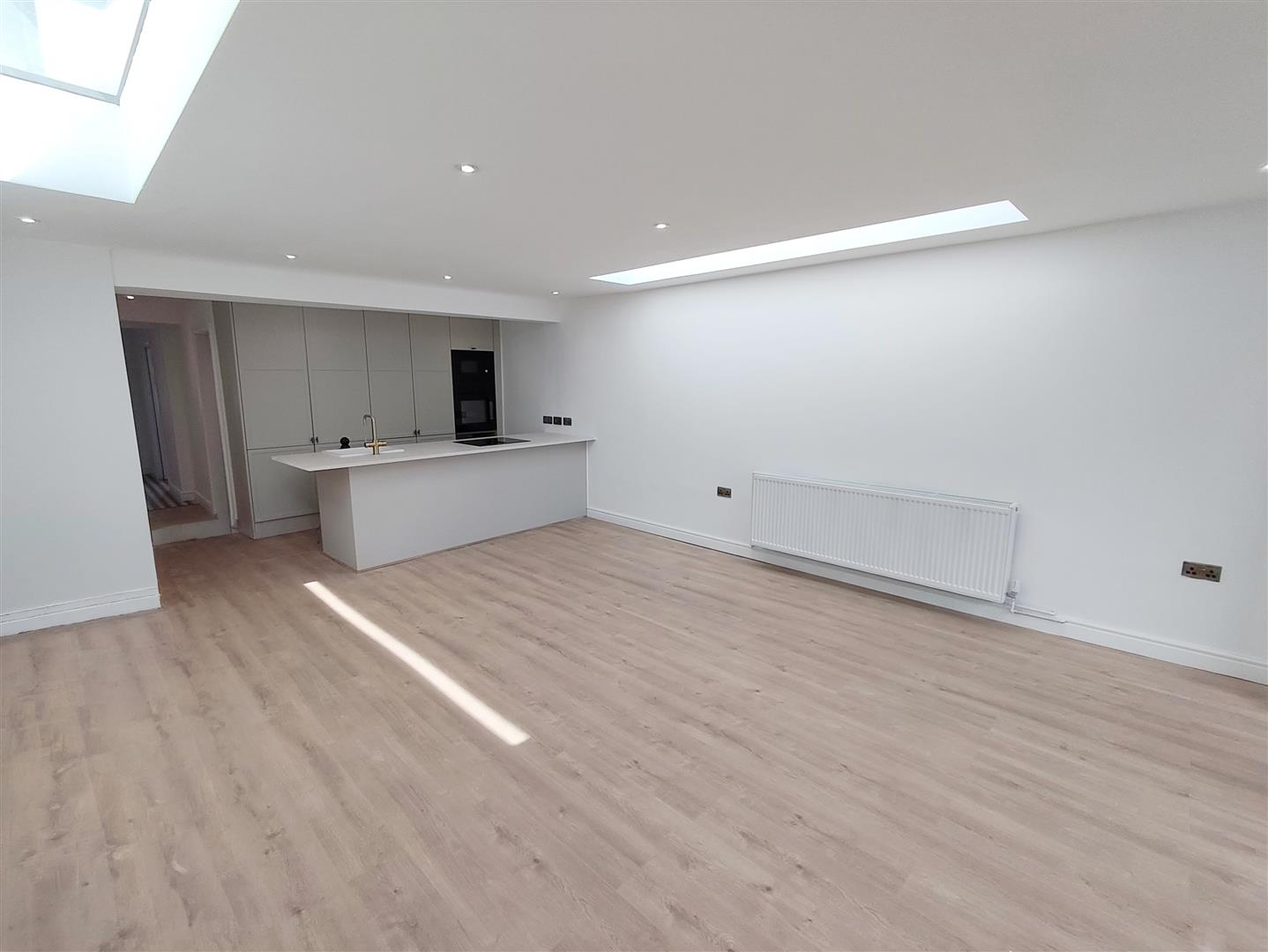 Superbly fitted Kitchen area with an Island workspace and breakfast bar. numerous quality units with integrated appliances including, electric oven with induction hob with a built in filter unit, instant hot water tap over a ceramic sink unit, full height larder style fridge and freezer, dishwasher, microwave, Bifold doors to the rear garden, two large skylights,