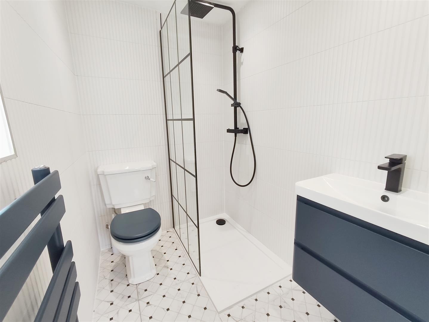 Three piece suite comprising, shower area with black hand held and monsoon head showers, vanity wash basin with monobloc tap and close couple w.c. Contemporary radiator, ceramic tiled pattered floor.