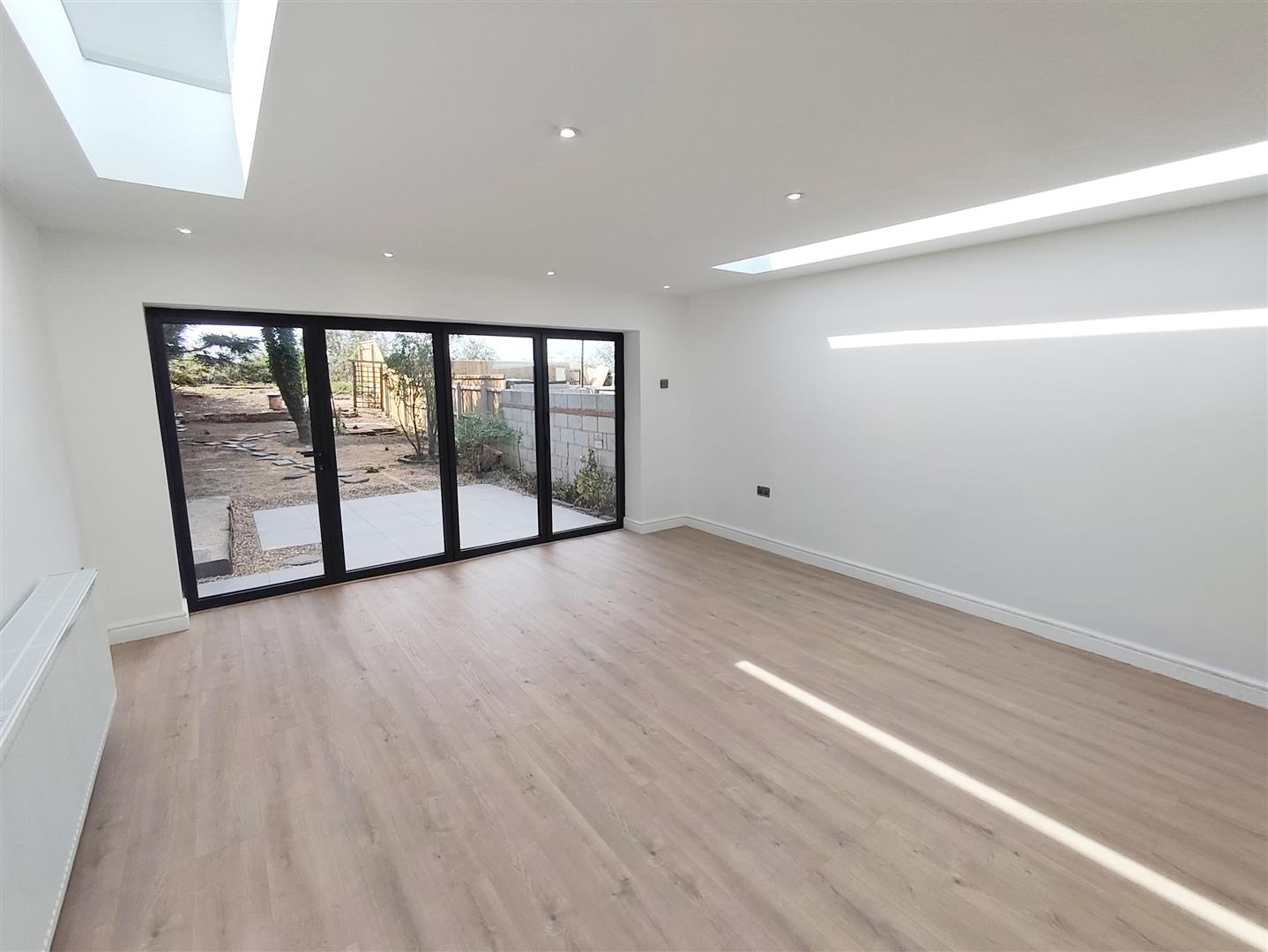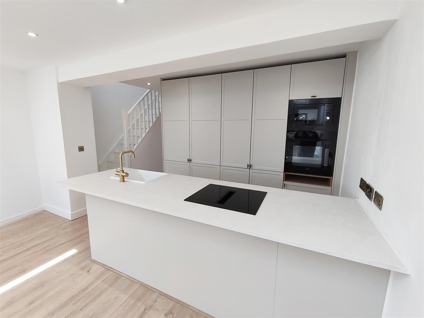 The heart of the home is the impressive open-plan living and kitchen area, designed to maximise both space and natural light. Full-length bifold doors open onto the garden, creating a seamless connection between indoor and outdoor living while offering uninterrupted views. The kitchen, supplied by Magnet, features traditional larder cupboards that add both character and practicality, along with high-spec integrated appliances, all energy-efficient and designed for modern living. These include an oven, microwave with grill, dishwasher, and induction hob, alongside a separate large fridge and freezer. A high-quality instant hot water tap and elegant white ceramic sink complete the space. The layout has been carefully designed so that cooking, washing, and daily activities can be carried out while still enjoying views of the garden and staying connected with guests. A breakfast bar comfortably accommodates four stools.