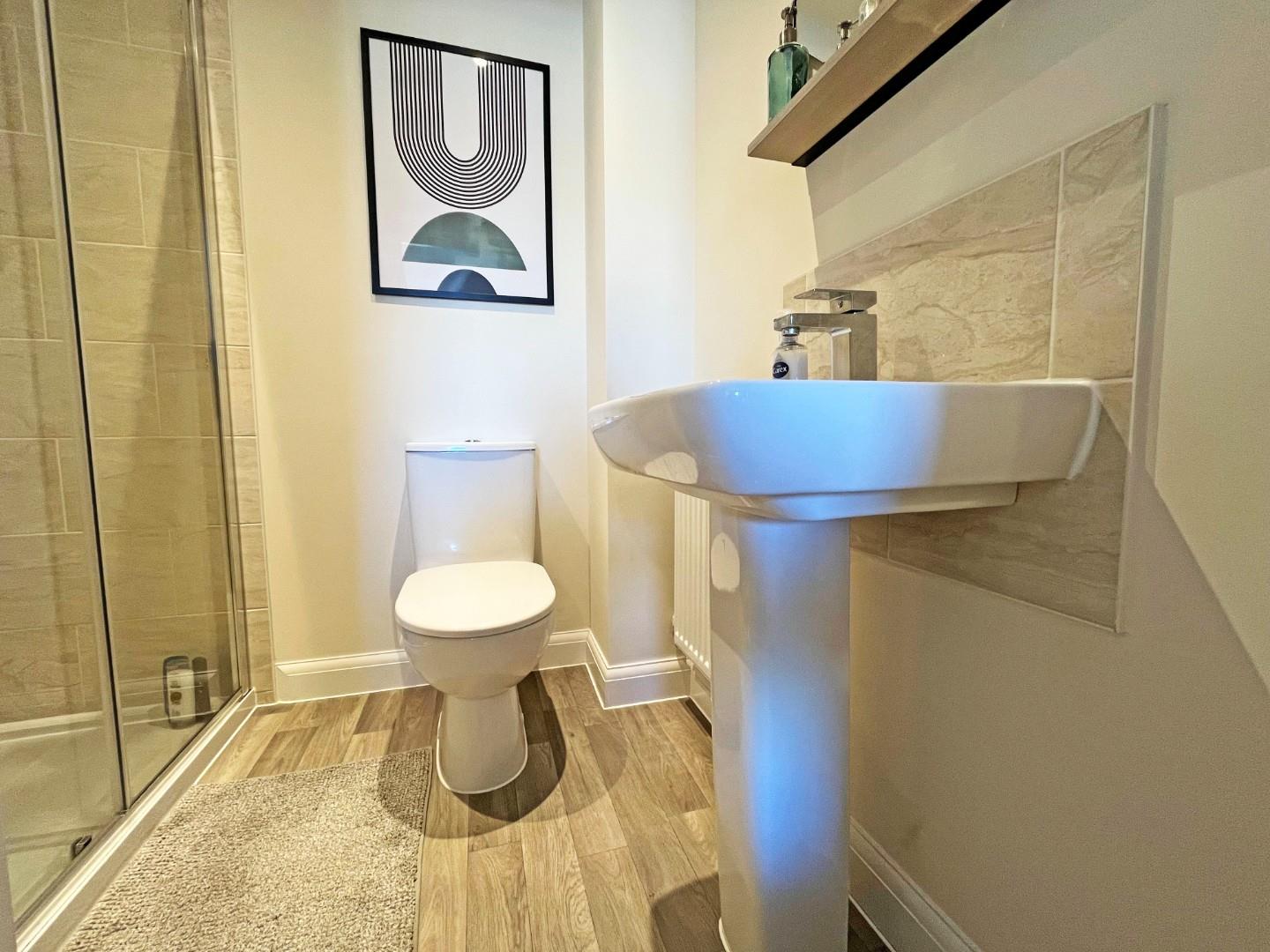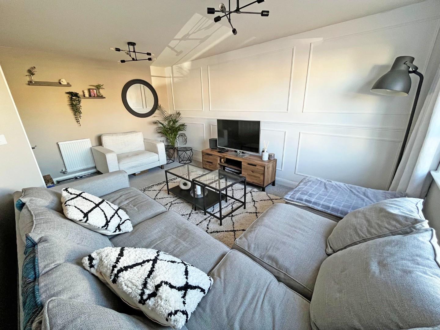 Outside- set back from the road, this property is nicely positioned with views of the lake and very close to open space and a children’s park. Driveway to the side with rear access. To the rear, an enclosed garden, mainly laid to lawn with a patio area.