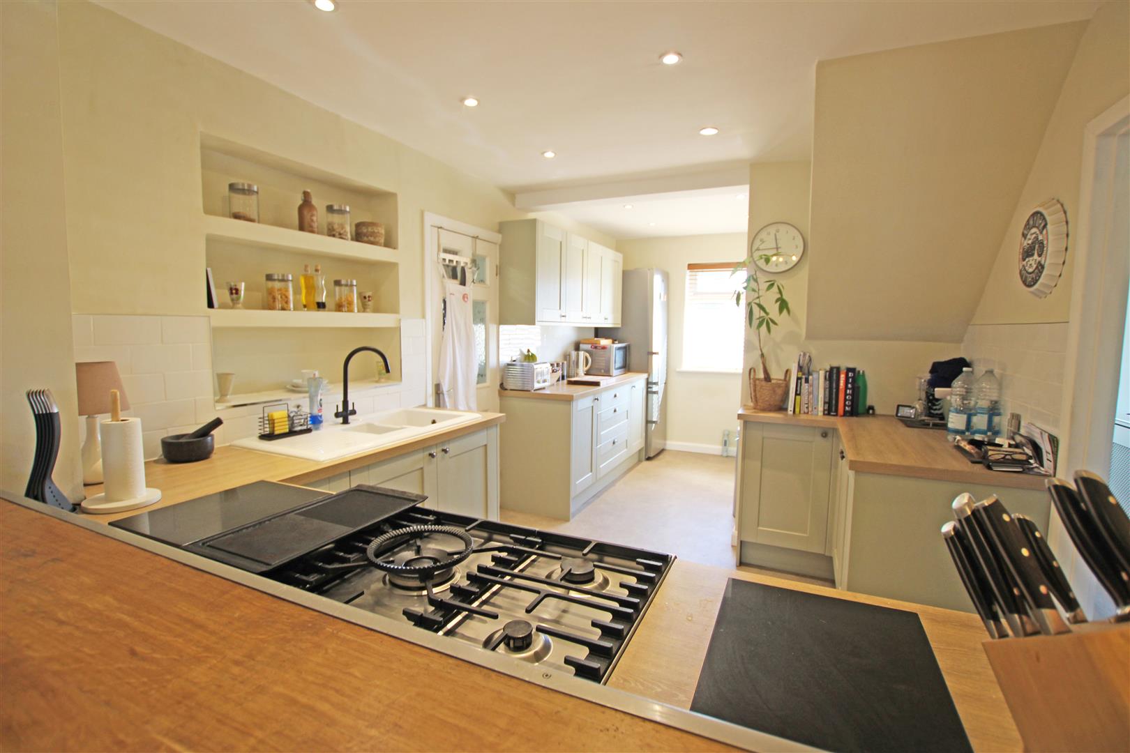 Fitted with a range of base and eye level kitchen units, door to