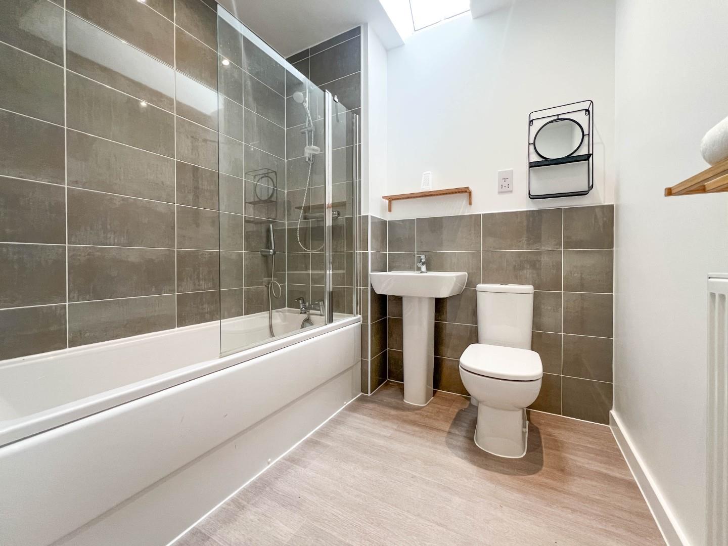 The property comprises a generous open-plan living area, a contemporary kitchen with integrated appliances, a large double bedroom, and a stylish bathroom. The layout also allows space for a home office setup, perfect for those working remotely.