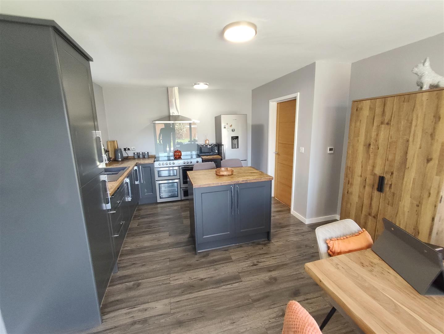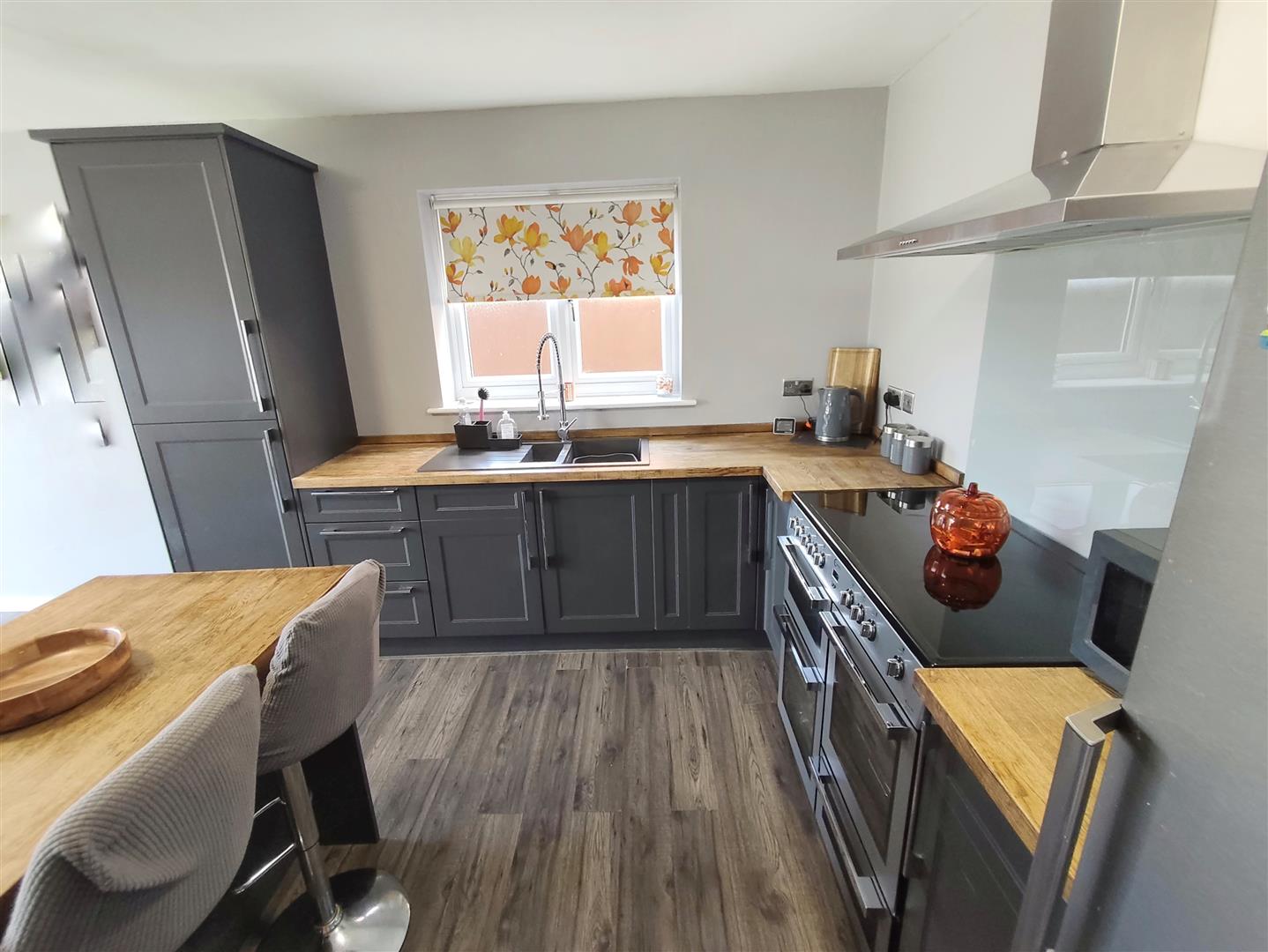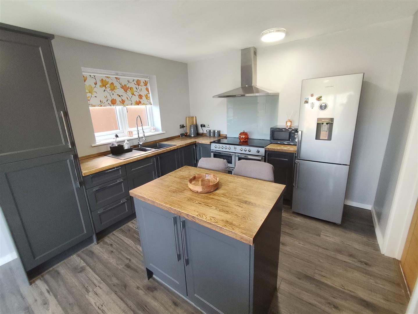 Fitted with a range of base and eye level Kitchen units with a matching Island breakfast bar and storage feature, wooden worktops, range size cooker hood, integrated dishwasher, fridge and freezer. Bifold doors to the rear Garden