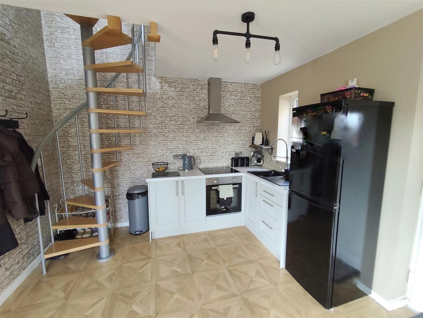 Corner positioned fitted Kitchenette with integrated electric oven, hob and hood. Door to the side of the property, spiral staircase to the first floor annex Bedroom.