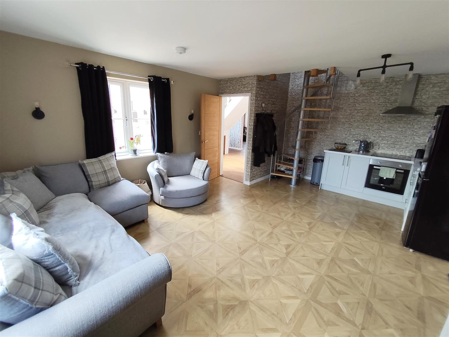 Spiral staircase to ground floor annex Lounge/Kitchenette, door to