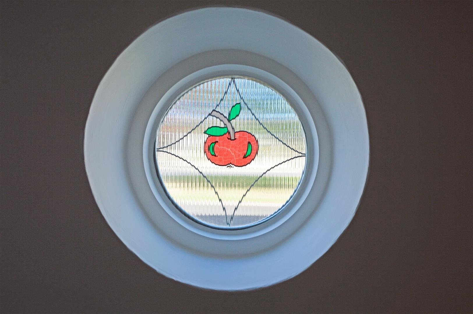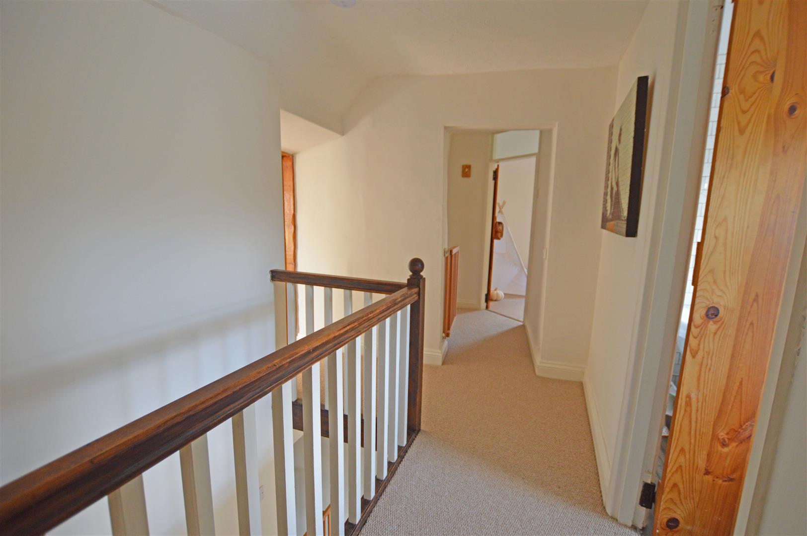 Stairs to the first landing with a utility cupboard below. Character window feature, opening through to