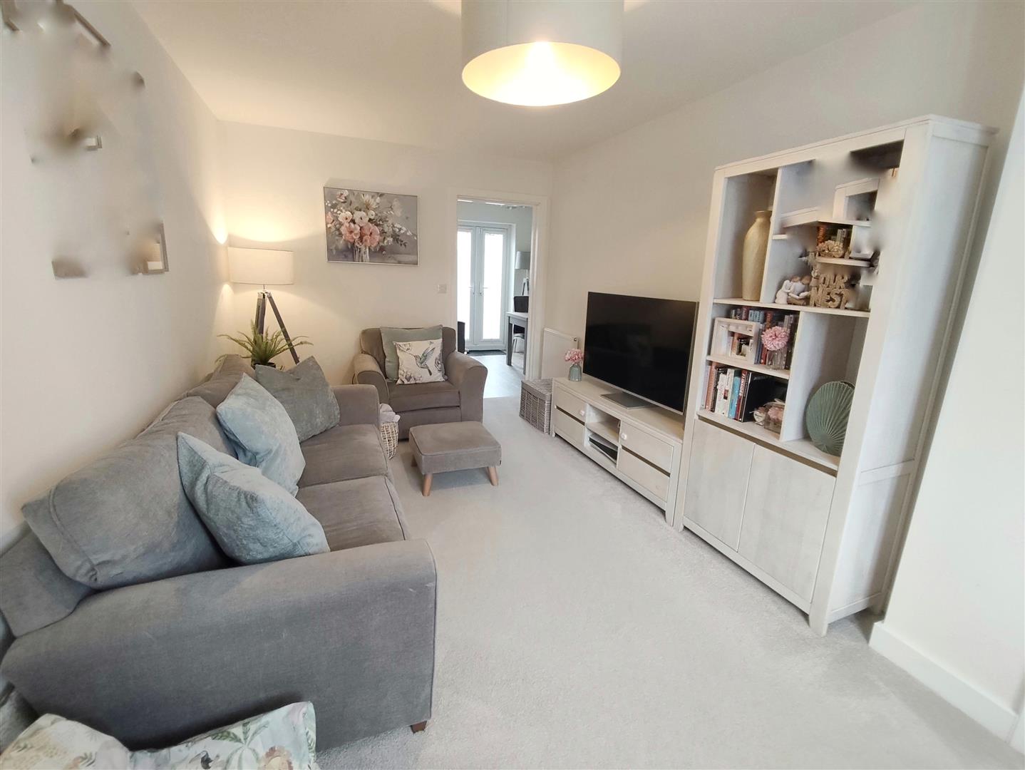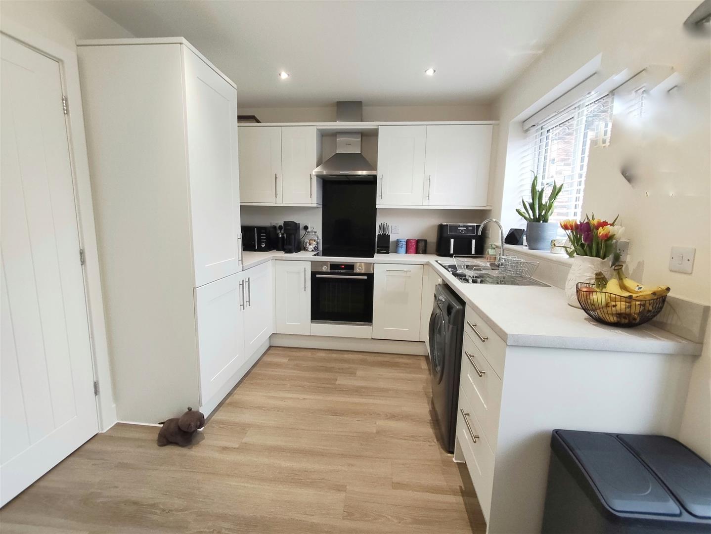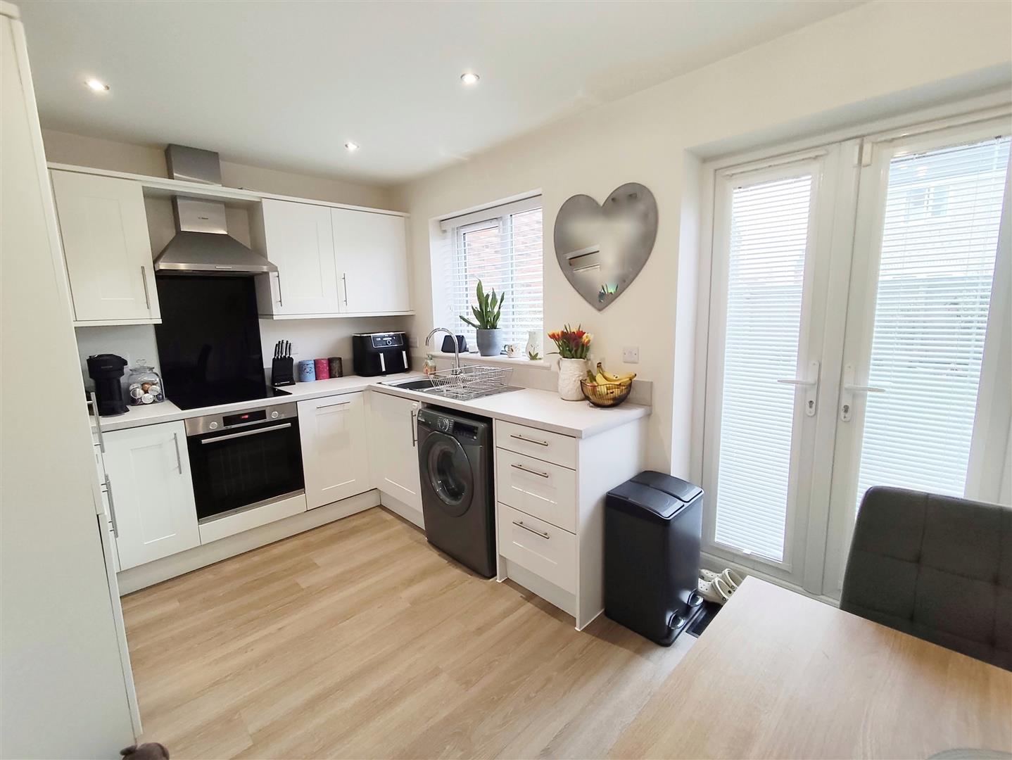 Fitted with a range of base and eye level kitchen units with integrated electric oven, induction hob and hood above. Built in dishwasher, fridge/freezer and plumbing for a washing machine. PVCu French doors to the rear garden.